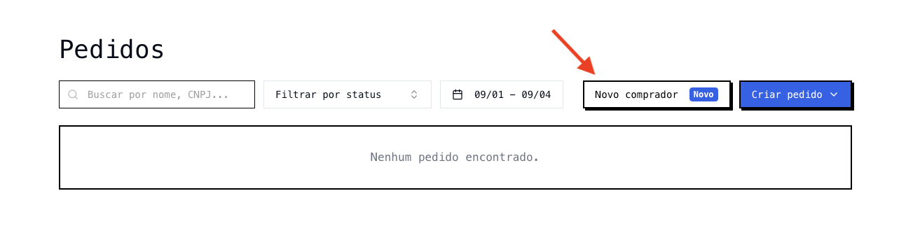 - Para criar um novo Comprador, clique no botão "Novo comprador" na aba de Pedidos ou Compradores.