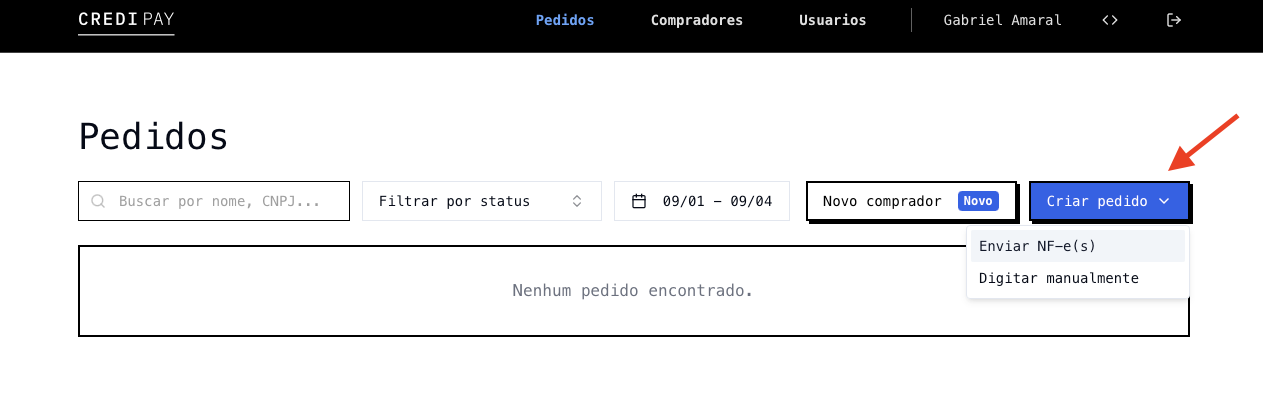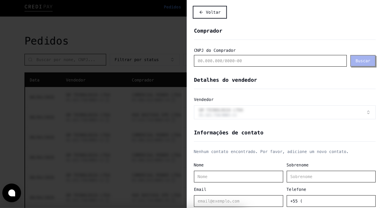 Antes de tudo, você vai precisar informar o CNPJ do comprador. O sistema vai verificar se ele existe na base e se possui limite de crédito disponível.