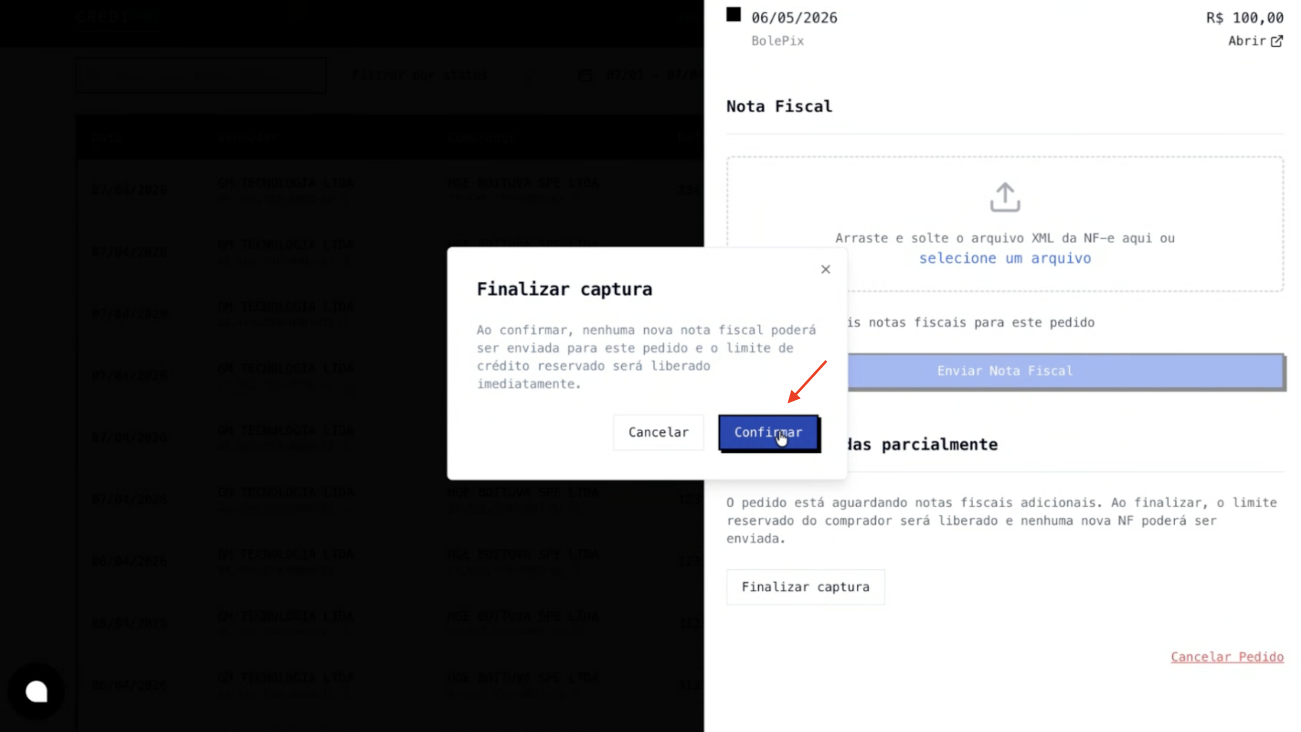 - Confirme a Ação: Um modal de confirmação aparecerá alertando que nenhuma nova nota poderá ser enviada. Clique em Confirmar.
