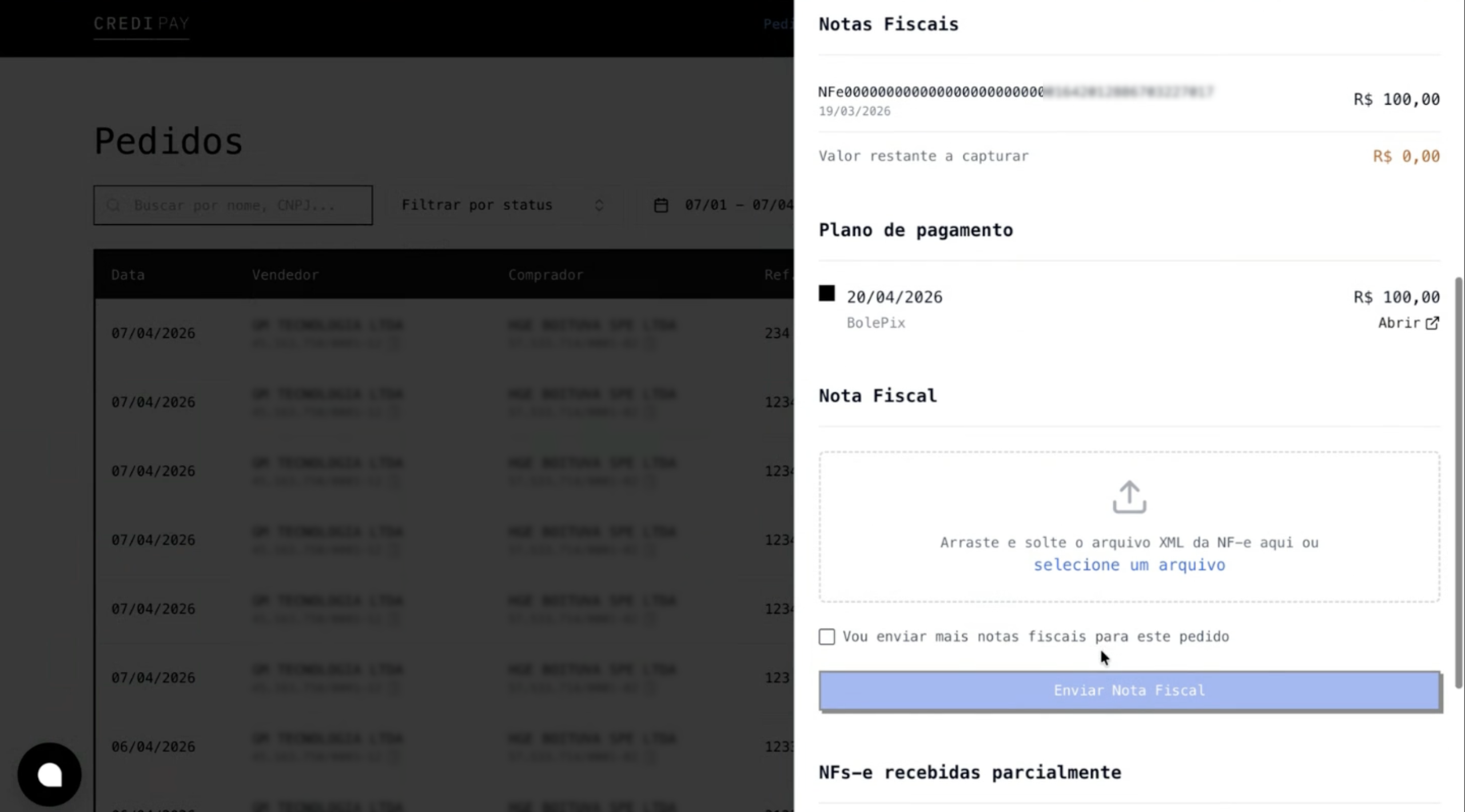 - Acesse a Seção de Envio: No mesmo pedido (agora com status NF-es recebidas parcialmente), vá até a seção de upload.