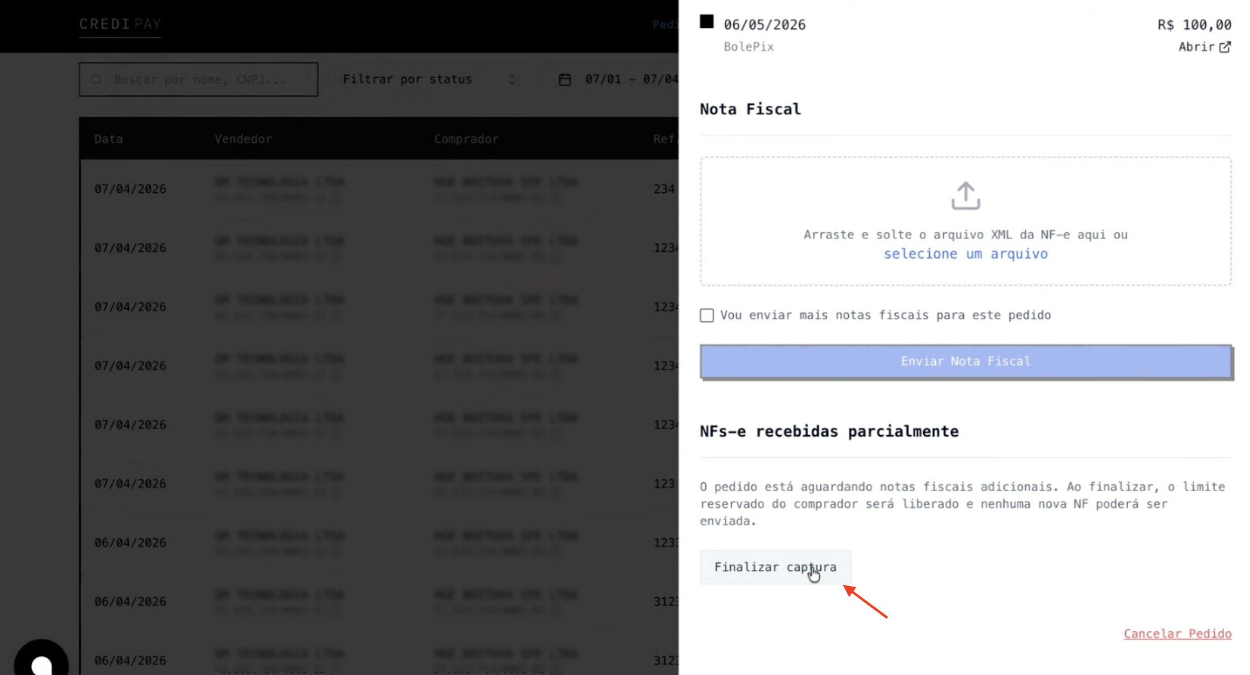 Siga este passo quando for enviar a última nota fiscal pertencente ao pedido, encerrando o ciclo de recebimento.