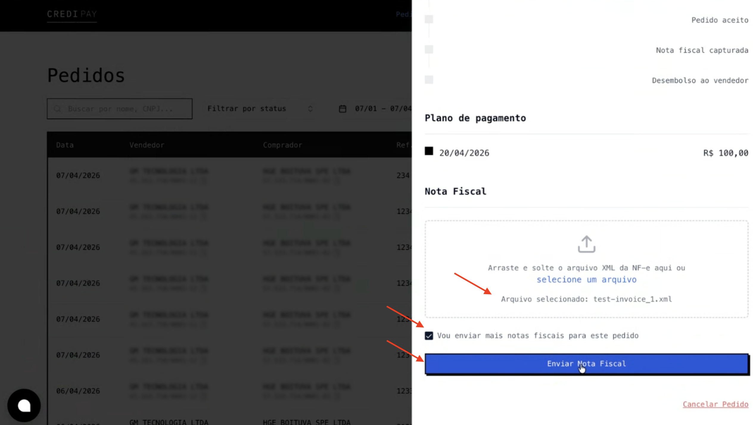 - Habilite o Recebimento Múltiplo: Role a página até a seção de Nota Fiscal. Antes de anexar o arquivo, marque a caixa de seleção "Vou enviar mais notas fiscais para este pedido".