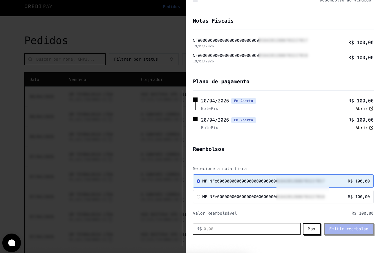 - Em Reembolsos, selecione a NF que gostaria de solicitar o reembolso e preencha com o valor total ou parcial total do pedido: